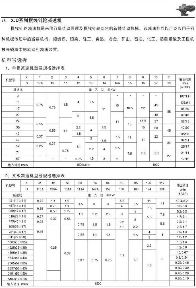 X . B擺線針輪減速機(jī)說(shuō)明單級(jí)減速機(jī)型號(hào)規(guī)格選擇表雙級(jí)減速機(jī)型號(hào)規(guī)格選擇表