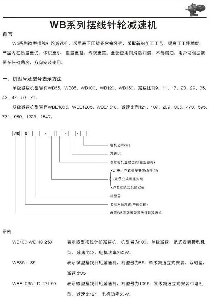 WB系列微型擺線針輪減速機(jī)描述機(jī)型號和規(guī)格表示法